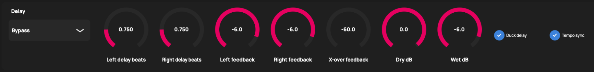 When Duck delay is on, the Wet signal of the delay is silenced if the input of the delay exceeds a certain threshold. If the input of the delay is below that threshold, the wet signal rises to the level set by Wet dB.