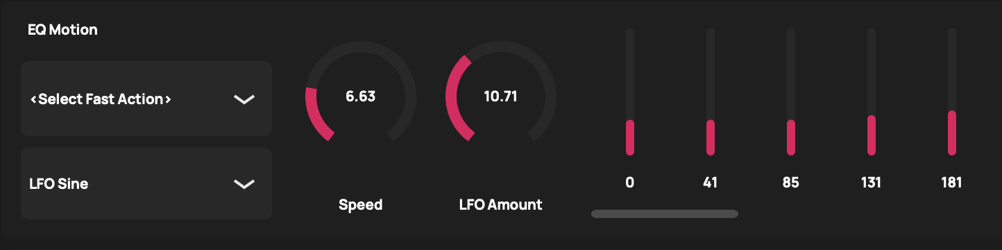 Motion EQ is a 60-band spectral EQ that can optionally be put in motion. Without motion, the effect functions like any other graphical EQ and allows you to increase or decrease the amplitude of a narrow frequency range. You turn motion off by selecting None from the second drop down menu below EQ Motion. The three other options are Always Up, Always Down, and LFO Sine. When Always Up is selected, the shape of the effect’s frequency response continuously moves up the frequency axis. When a value reaches the top of the frequency range, it wraps around to the bottom. Always down is the same but has the opposite direction of motion. You can control the speed of the motion with the Speed knob that appears when Always up, Always down, or LFO Sine is selected.
