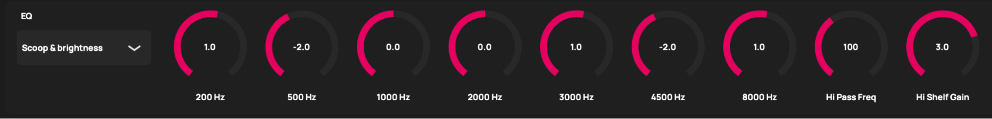 Sets the amount of gain to a high shelf filter with a fixed cutoff of 12000 hz. Mix engineers often give a gentle boost to the highs to create an impression of air.