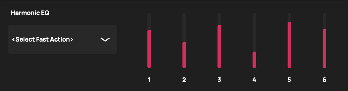 The Resynthesizer tab presents a variety of possibilities for processing individual voices, including spectral effects that manipulate the frequency and amplitude of individual harmonics. Some of these effects involve many individual parameters, and in order to save time and suggest interesting possibilities when using these effects, Voloco Producer offers what we call Fast Actions. Fast Actions function as a kind of sub-preset and set parameter values for all of the parameters in a given module. For example, one Fast Action for Harmonic EQ can boost the amplitude of all odd-numbered harmonics.