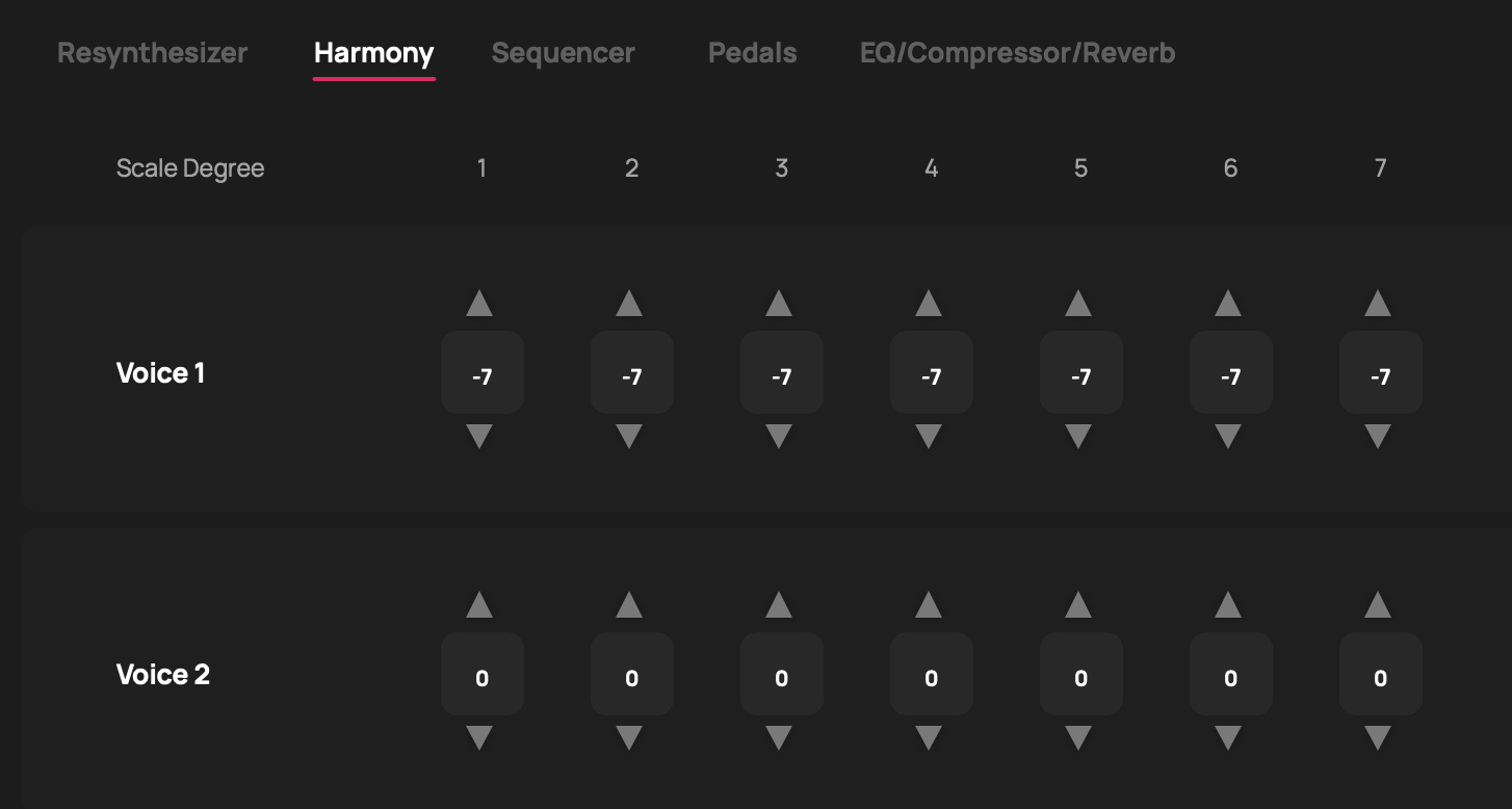 In the Harmony tab, users specify how many scale steps each Voice will transpose a pitch at each scale degree. If you enter all 0s for every scale degree for a Voice, the pitch of the output for that Voice will always be untransposed–it will be the same scale degree in the same octave as the input. A value of 1 will transpose output of that Voice up one scale degree. The exact interval of the transposition depends on the scale in use and the scale degree of the input.