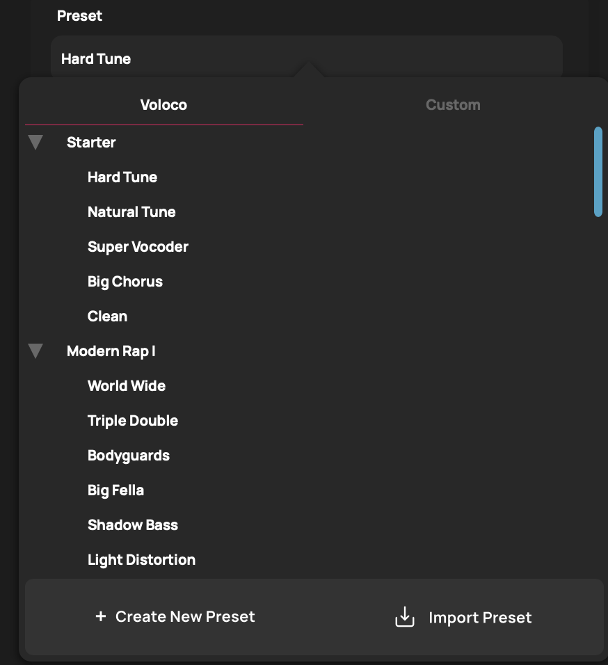 The Preset Manager presents two columns, labeled Voloco and Custom. In the Voloco column you will find factory presets, and under Custom you will see presets that you have created or imported. Click on a preset to load it.