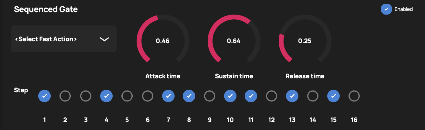 The Sequenced Gate is a rhythmic effect that applies amplitude envelopes to the signal at user-selected time points.
