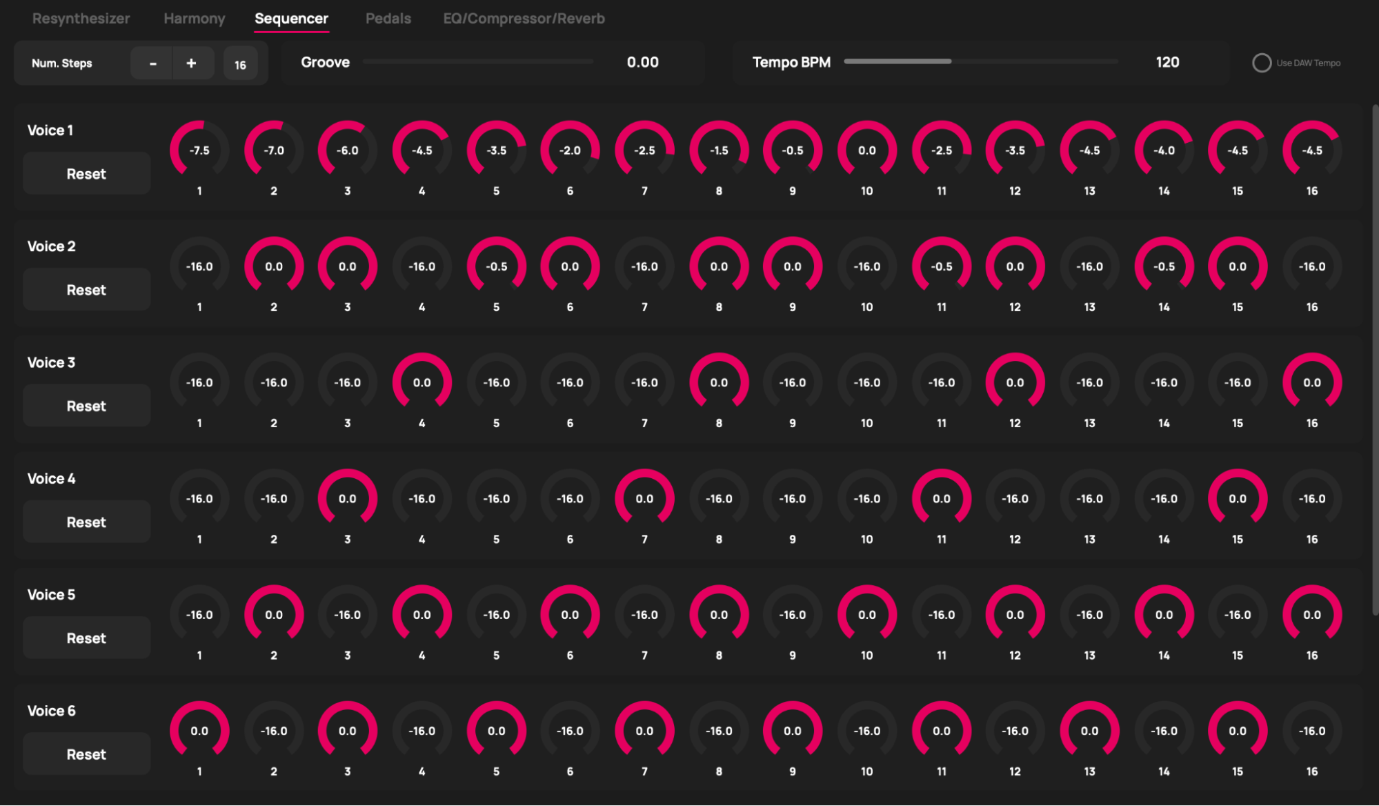 Each step for each voice in the sequencer adjusts the volume of the voice at that step. The dynamic range of each knob is 16dB. If a knob is turned all the way down, the voice is silenced at that step.