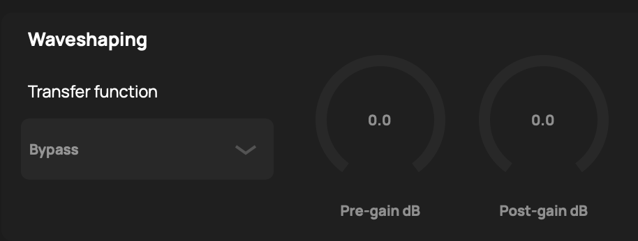 Controls how much gain is applied after the transfer function. Sometimes you might want to distort a signal heavily by cranking up the pre-gain but you don’t want the output signal to be loud. In this case you might apply a high pre-gain and reduce the post-gain by a similar amount.